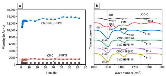 (a) Viscosity curves of CMC, HBPEI, CMC-NH3-HBPEI; (b) FTIR spectra of CMC, HBPEI, CMC-HBPEIB 60, 70, 80, and 90.