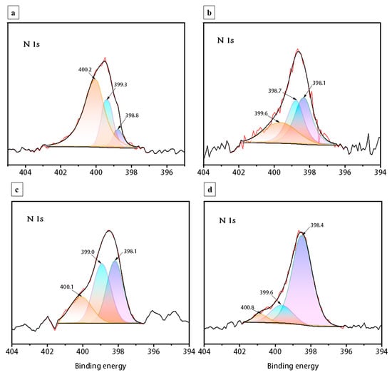 N1s spectra of XPS of CMC-HBPEI dried at 60 (a), 70 (b), 80 (c), and 90 °C (d), respectively.