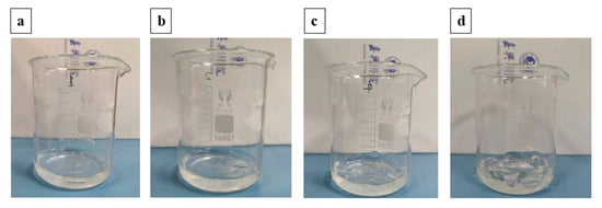(a) CMC-HBPEI-60, (b) CMC-HBPEI-70, (c) CMC-HBPEI-80, and (d) CMC-HBPEI-90 digital photos after immersion in 1 M NaOH solution for 12 h.