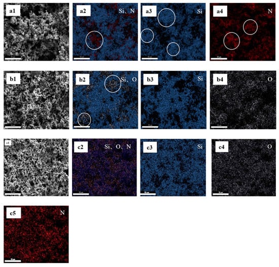 EDX has high spatial resolution and can intuitively display the distribution of Si nanoparticles and binder on the electrode surface within a millimeter range. Therefore, the combination of SEM and EDX is a suitable method for observing the surface morphology and elemental distribution of Si anodes with different binders [21]. The SEM images show that in the Si/HBPEI anode, Si nanoparticles and HBPEI are unevenly dispersed (Figure 5a1). In addition, the EDX spectrum reveals that the Si and N elements in HBPEI are not well overlapped (such as those circles in Figure 5a2) and are completely separated in several regions, as indicated by the circles in Figure 5a3,a4. This indicates that low-viscosity HBPEI tends to self-aggregate and cannot completely cover Si nanoparticles. SEM images (Figure 5b1) indicate that there is no significant aggregation of Si or CMC when Si nanoparticles are coated on Cu foil with CMC as a binder. The EDX spectrum shows that the distribution of Si and O elements is largely overlapping (Figure 5b2), but some areas containing only O elements can still be seen (such as those circled in Figure 5b2). This indicates that CMC can only roughly cover Si nanoparticles rather than uniformly cover them. The FESEM image shows a uniform and dense 3D network structure for the Si/CMC-HBPEI sample (Figure 5c1). This anode shows a more even distribution of Si, O, and N elements compared to Si/HBPEI and Si/CMC anodes (Figure 5c2). This indicates that there are interactions such as hydrogen bonds, ion bonds and covalent bonds between CMC and HBPEI which can improve their compatibility and coverage with Si nanoparticles. Therefore, in the CMC matrix, Si nanoparticles are well dispersed and covered with HBPEI.