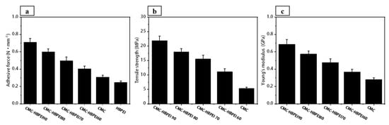(a) Average peeling strength of CMC-HBPEI-90, 80, 70, 60; CMC and HBPEI; (b) Tensile strength of CMC-HBPEI-90, 80, 70, 60, and CMC; (c) Young’s modulus of CMC-HBPEI-90, 80, 70, 60, and CMC.