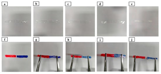 Digital photos of CMC (a,f), CMC-HBPEI-60 (b,g), CMC-HBPEI-70 (c,h), CMC-HBPEI-80 (d,i), CMC-HBPEI-90 (e,j) membranes before and after the self-healing test.