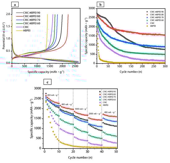 To assess the electrochemical characteristics of Si anodes bound with CMC-HBPEI, a series of galvanostatic charge–discharge tests are performed on Li/Si half-cells [21]. The galvanostatic curves presented in Figure 8a illustrate the initial electrochemical performance of Si anodes with CMC, HBPEI, and CMC-HBPEI-60, 70, 80, and 90 as binders. The initial coulombic efficiencies (ICEs) of Si/CMC and Si/HBPEI were 62.11% and 57.20%, respectively. The ICEs of Si anodes using CMC-HBPEI binders are higher than those of CMC and HBPEI. The ICEs of Si/CMC-HBPEI-60, 70, 80, and 90 are 65.87%, 68.31%, 84.32%, and 75.54%, respectively. The insignificant increase in ICE value of Si/CMC-HBPEI-60 may be attributed to the inadequate mechanical stability of the ionically cross-linked network structure, which fails to withstand the stress caused by the volume expansion of Si and cannot fully encapsulate Si nanoparticles. As a result, a significant amount of electrolyte is consumed on the exposed Si surface to form a solid electrolyte interface (SEI) layer during the first cycle [8,9,10]. The highest ICE value of Si/CMC-HBPEI-80 indicates that the dual cross-linked network structure coexisting with physical and chemical cross-linking can embed Si nanoparticles tightly into the matrix and completely cover them, greatly reducing the consumption of electrolytes on the Si surface [21,44].