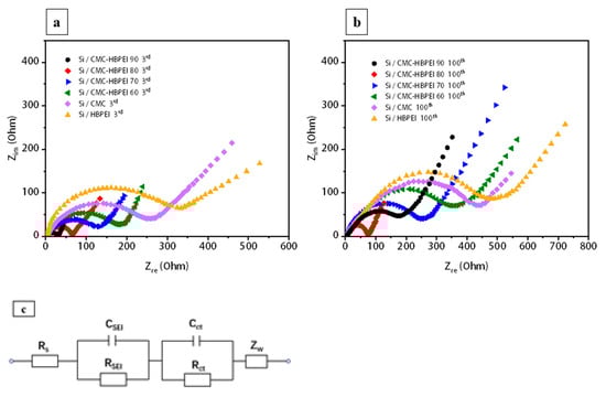 Nyquist plots of different Si anodes after 3 cycles (a) and 100 cycles (b); (c) the equivalent circuit model.