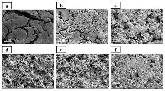 SEM images of Si/HBPEI (a), Si/CMC (b), Si/CMC-HBPEI 60 (c), Si/CMC-HBPEI 70 (d), Si/CMC-HBPEI 80 (e), and Si/CMC-HBPEI 90 (f) anodes after 100 cycles.
