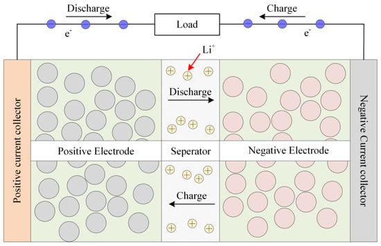 The charging and discharging of LIBs mainly depends on the deinking and embedding of lithium ions between the positive and negative electrodes [30], as shown in Figure 1. The majority of current electrochemical models fail to incorporate the impact of elevated current rates and fluctuating environmental temperatures on model parameters. The precision of battery terminal voltage simulation under conditions of high-current-rate charging and discharging is insufficient, thereby impeding the determination of safety thresholds for subsequent charging and the development of expeditious charging protocols.