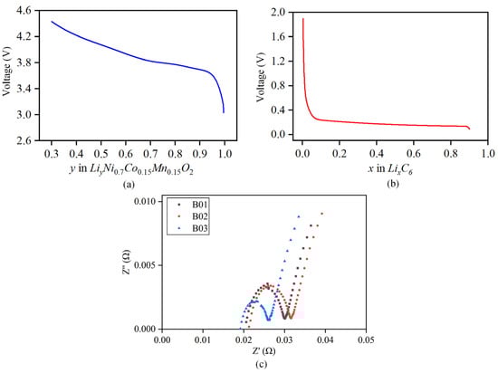 where and are the intrinsic open circuit potential curves of the positive and negative electrodes of the utilized LIBs, which are exclusively connected to the anode and cathode electrode materials and may be acquired by charging and discharging at a low rate. and represent the initial lithium concentrations of the anode and cathode, respectively. and correspond to the maximal level of anode and cathode lithium-ion re-embedding. is the capacity of the battery. and are the embedded lithium concentration ranges.