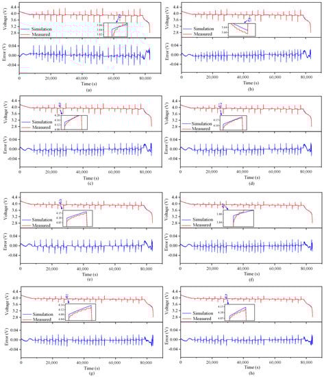 Simulation terminal voltage and error curve at different temperatures (B01). (a) 5 °C. (b) 10 °C. (c) 15 °C. (d) 20 °C. (e) 25 °C. (f) 30 °C. (g) 35 °C. (h) 40 °C.