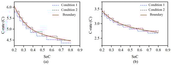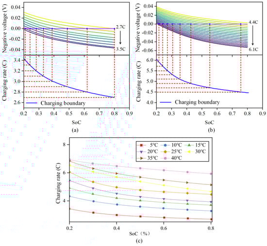 Taking the ambient temperature of 5 °C to 40 °C, the curve of the change in negative potential with SoC when charging from 20% SoC to 80% SoC at different constant current rates was simulated, as shown in Figure 6c. The intersection point of the negative potential with 0 V at different constant current rates and the corresponding SoC were obtained to obtain the corresponding charging safety boundary.