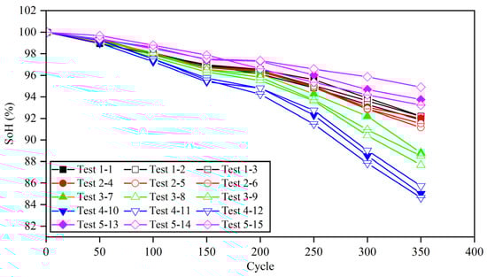 In order to guarantee the precision and universality of the parameter identification outcomes, the 16 batteries exhibiting comparable performance, as outlined in Section 2.2, were evenly partitioned into two groups. Two groups conducted parameter identification at varying ambient temperatures. The first group performed the identification at temperatures of 5 °C, 15 °C, 25 °C, and 35 °C, while the second group conducted the identification at temperatures of 10 °C, 20 °C, 30 °C, and 40 °C.