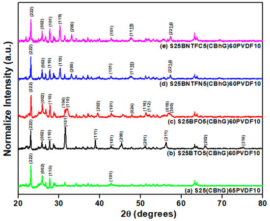 XRD spectra of (a) S25(CBhG)65PVDF10, (b) S25BTO5(CBhG)60PVDF10, (c) S25BFO5(CBhG)60PVDF10, (d) S25BNTFN5(CBhG)60PVDF10, and (e) S25BNTFC5(CBhG)60PVDF10 composites.