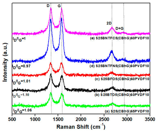 Figure 2a–e shows the Raman spectra for the S25(CBhG)65PVDF10 and S25FNPs5(CBhG)60PVDF10 composites. The pronounced D band (disorder-induced phonon mode) at approximately 1336 cm−1 and G band (associated with in-plane vibration of the graphite lattice) at approximately 1575 cm−1 suggest a graphite-like carbon framework [45,46]. The intensity ratios (ID/IG) shown in Figure 2a (ID/IG was 1.06 for S/CBhG/PVDF), Figure 2b (ID/IG was 1.10 for S/BTO/CBhG/PVDF), Figure 2c (ID/IG was 1.01 for S/BFO/CBhG/PVDF), Figure 2e (ID/IG was 1.00 for S/BNTFC/CBhG/PVDF), and Figure 2d (ID/IG was 0.97 for S/BNTFN/CBhG/PVDF) were slightly reduced, presumably due to defect removal through the combined effects of ferroelectric nanoparticles doping. The Raman peaks for 2D and D + G were also visible at approximately 2700 cm−1, this was attributed to the layered structure of the graphene.