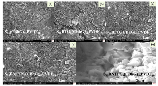 SEM images of (a) S25(CBhG)65PVDF10, (b) S25BTO5(CBhG)60PVDF10, (c) S25BFO5(CBhG)60PVDF10, (d) S25BNTFN5(CBhG)60PVDF10, and (e) S25BNTFC5(CBhG)60PVDF10 composites with magnification of ×15000 at 1 μm.
