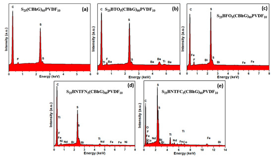 EDS of (a) S25(CBhG)65PVDF10, (b) S25BTO5(CBhG)60PVDF10, (c) S25BFO5(CBhG)60PVDF10, (d) S25BNTFN5(CBhG)60PVDF10, and (e) S25BNTFC5(CBhG)60PVDF10 composites.