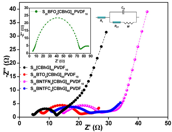 Figure 5 shows the Nyquist plots for the S25(CBhG)65PVDF10, S25BTO5(CBhG)60PVDF10, S25BNTFN5(CBhG)60PVDF10, and S25BNTFC5(CBhG)60PVDF10 composites. The Nyquist plot of the S25BFO5(CBhG)60PVDF10 composite is shown in the inset for clarity. All the EIS spectra showed depressed semicircles in the high-frequency region, corresponding to the charge-transfer process, and a sloping straight line in the low-frequency region was consistent with the semi-infinite Warburg diffusion process [45,46].