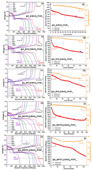 Charge-discharge profiles and specific capacity, Coulombic efficiency in function cycle number spectra of battery with S25(CBhG)65PVDF10 at various current densities from 0.2 mA/cm2 to 0.3 mA/cm2 (a–f), battery with S25BTO5(CBhG)60PVDF10 (b–g), battery with S25BFO5(CBhG)60PVDF10 values (c–h), battery with S25BNTFN5(CBhG)60PVDF10 values (d–i), and battery with S25BNTFC5(CBhG)60PVDF10 values (e–j). All batteries were run over cycling at 0.2 mA/cm2 (first 3 cycles were run at 0.3 mA/cm2).