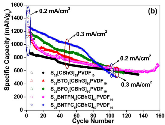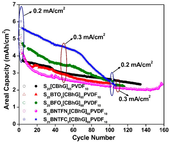 Figure 8 shows that the values of areal capacity reached 4.84 mAh/cm2, 5.08 mAh/cm2, 5.60 mAh/cm2, 5.12 mAh/cm2, and 6.74 mAh/cm2 for the S25(CBhG)65PVDF10, S25BTO5(CBhG)60PVDF10, S25BFO5(CBhG)60PVDF10, S25BNTFN5(CBhG)60PVDF10, and S25BNTFC5(CBhG)60PVDF10 cathode composites, respectively. Among the investigated composites, the highest areal capacity was obtained for the S25BNTFC5(CBhG)60PVDF10 cathode [49].