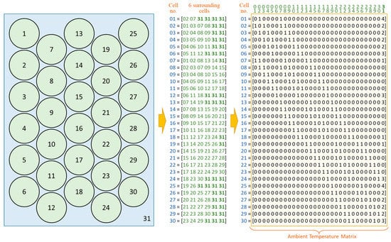 The temperature distribution within the battery module is related to the arrangement of the cells and their heat transfer characteristics. As the cells are arranged closely together within the battery module, for cylindrical cells, each cell is surrounded by six adjacent cells. Each cell exchanges heat with the other six cells surrounding it. For a single cell, the average temperature of the six cells around it forms the ambient temperature of that cell. For a cell at the edge of the battery module, the temperature of the cells that do not exist around it can be replaced by the ambient temperature of the whole module. Therefore, an ambient temperature matrix can be designed to transform the cell temperature vector into an ambient temperature vector. This is shown in Figure 2.