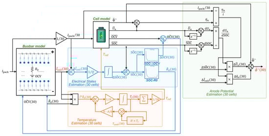 A block diagram of the final design of the observer is shown in Figure 3. Two models were used in the observer, a cell model to simulate the detailed electrochemical reactions inside the cells and a busbar model to simulate the current distribution in the module and the interconnection currents between the cells. The inputs to the cell model were the average current and temperature of all cells. The outputs of cell model included the OCV, SOC, anode potential, and OCV of negative electrode. The interconnection resistance in the busbar model was assumed to be of constant value. The inputs to the busbar model were the total current of the input pack, the estimated OCV, and internal resistance of each cell. In addition to cell and busbar model, the observer was divided into three estimation components. In order to reduce the computational load of the observer, it was assumed that the current difference between cells was much smaller than the cell currents. The electrical state was estimated by integrating the current difference calculated from the busbar model to obtain the SOC difference of each cell. The OCV and equivalent internal resistance of each cell was then obtained by a look-up-table. The temperature was estimated by calculating the heat generation of each cell from the Joule–Lorentz law, and then, the temperature changed for each cell by using the heat transfer matrix illustrated in Figure 2. The anode potential was also estimated using a linear estimation method but was slightly different from the method of electrical state estimation. The anode potential of a cell can be divided into two parts depending on whether it is current dependent. The OCV of negative electrode was only related to SOC and, therefore, the rate of change was calculated from the output of the cell model and multiplied by the estimated SOC distribution of cells in the module. The remaining part is represented by the over-potential, which was assumed to be in proportional to the current over a small range. The over-potential distribution was obtained by calculating its change rate and multiplying it by the current difference. The two estimated parts were added to the reference anode potential estimated by the cell model to obtain the anode potential distribution of all cells in the battery module.