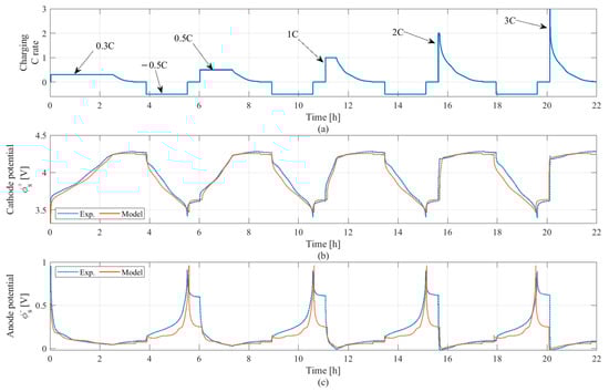 The results shown in Figure 4 verify that the modelled cathode and anode potentials matched the experimentally tested value of potentials in most charging profiles. The estimation performance of charging cycles was acceptable. It can be concluded that the model can perform well to the actual behavior of the target LIB at any C rate of charging current.