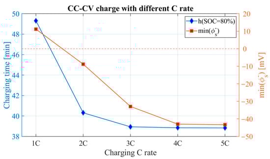 From the results above, it can also be found that the higher the charging C-rate, the lower the anode potential can reach. However, as the C-rate mainly acts on the CC stage of the CC-CV charging cycles, when the C-rate in the CC stage is high, the charging time of the CC stage is shortened due to the internal resistance. The charger will then switch it to the CV stage after the terminal voltage reaches the threshold. Therefore, from the above results, the CC cycle of 3C charging only lasts a few seconds. If further increase the charging C-rate, it will not see a significant reduction in the total charging time. This can also be found in the result of the charging time and the minimum anode potential at different charging rates, as shown in Figure 5 below.