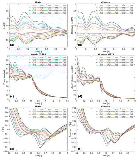 Figure 6c,d show the model-simulated and observer-estimated power loss on internal resistance, respectively. The power loss on the internal resistance generated heat and affected the temperature of the cell, ultimately affecting the thermal behavior of each cell. As the battery module was modelled using 30 TSPMe cell models, the power loss was obtained from the product of the voltage difference between the terminal voltage (Vt) and the open circuit voltage (U) and the charging current (i). The observed power loss was calculated as the product of the current squared and the equivalent resistance. As the observer used a different method to calculate the power loss, the error in the estimation of the cell temperature distribution was more obvious compared to the estimation of the current distribution. Figure 6e,f show the anode potential from the model and the estimates from the observer, respectively.