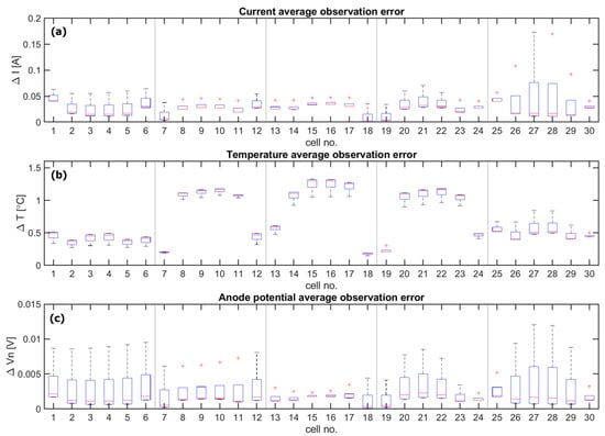 Average observation error of current, temperature, and anode potential for each cell that located at different column. Average observation error of (a) current of each cell, (b) temperature of each cell, (c) anode potential of each cell.