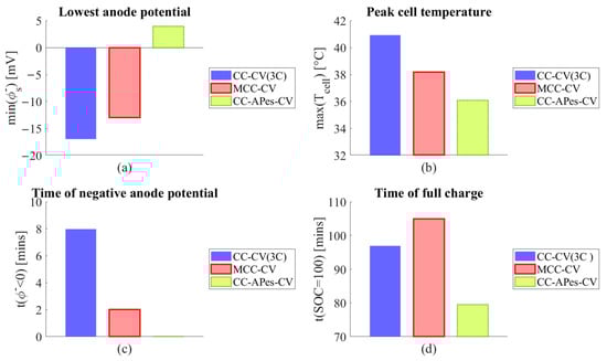 The comparison between these three methods used bar charts to represent the minimum anode potential, peak cell temperature, time period of anode potential being negative, and full charging time, as shown in Figure 9. The results show that the proposed method eliminated the risk of negative anode potential, reduced the peak battery temperature by 5 °C, approximated 9.8% of the temperature of using CC-CV, and reduced the overall charging time to full SOC by 18% compared to the conventional CC-CV charging method.