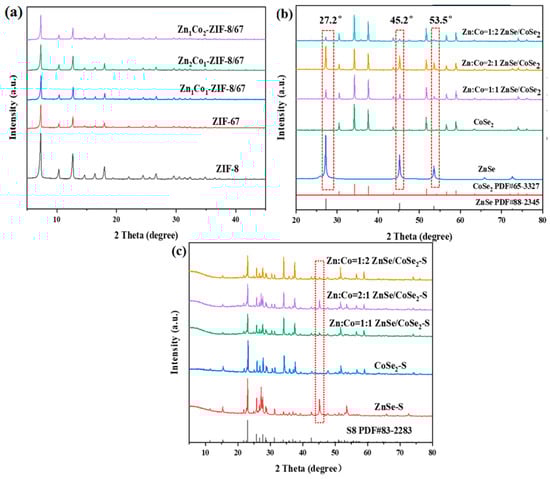 (a) XRD patterns of ZIF-8, ZIF-67, and ZIF-8/67 precursors with different Zn–Co ratios; (b) XRD patterns of ZnSe, CoSe2, and ZnSe/CoSe2 composites with different Zn–Co ratios; (c) XRD patterns of ZnSe–S, CoSe2–S, and ZnSe/CoSe2–S cathode materials with different Zn–Co ratios.