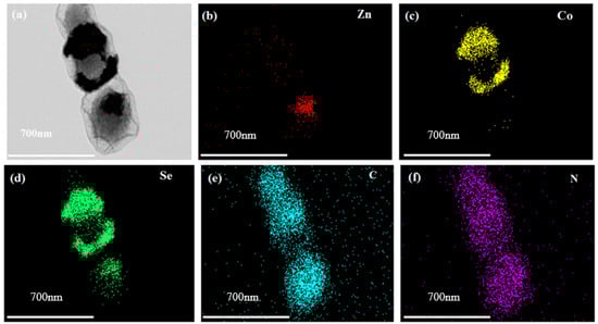 The ZnSe/CoSe2 prepared by ZIF-8/67 has the best morphology when Zn:Co = 1:1. As shown in Figure 4, the morphology and structure of ZnSe/CoSe2 are further characterized by transmission electron microscope (TEM). Figure 4a exhibits that the synthesized ZnSe/CoSe2 has a hollow dodecahedron structure. The corresponding element distribution scanning is performed, and the distribution is observed in Figure 4b–f. Apparently, for the composite material, C, N, and Se elements are detected throughout the scan range and are uniformly distributed in the composite material. A small amount of Zn is located at the edge of the polyhedral framework, and most of the Co element is located at the two sides and the middle of the polyhedron, which also confirms that the nanoparticles ZnSe and CoSe2 are uniformly dispersed in the core-shell structure. Importantly, the composite material has a hollow structure, and a large number of voids between the hollow structures can not only encapsulate the single sulfur to improve the volume expansion but also reduce the aggregation and crushing of the electrode material, contributing to the stable cycling performance. The N-doped amorphous carbon in the whole material can provide a large number of reactive active sites and enhance conductivity.