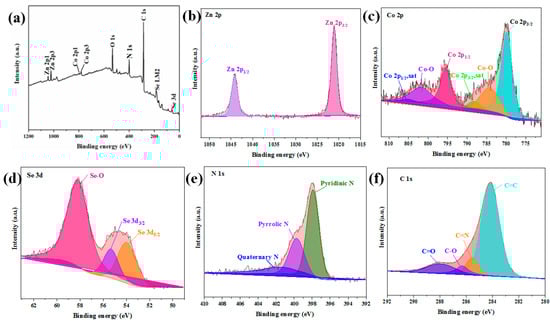 (a) The survey XPS spectrum of ZnSe/CoSe2 with Zn:Co = 1:1 composite, (b) Zn2p XPS spectrum, (c) Co2p XPS spectrum, (d) Se3d XPS spectrum, (e) C1s XPS spectrum, and (f) N1s XPS spectrum.