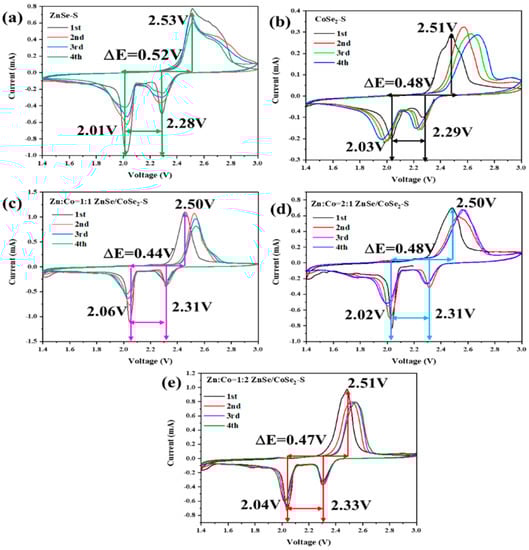Figure 6a–e show the cyclic voltammetry (CV) curves of ZnSe–S, CoSe2–S, and ZnSe/CoSe2–S cathode materials with different Zn–Co ratios at 0.1 mV s−1. Figure 6a shows the CV curve of the ZnSe–S electrode. Two reduction peaks are located at 2.28 V and 2.01 V, which correspond to the long-chain lithium polysulfide (Li2Sn, 4 < n ≤ 8) formed by S8 breaking during the discharge process. With thorough discharging, long-chain lithium polysulfide is further reduced to form lithium sulfide (Li2Sn, n ≤ 2) insoluble in electrolyte [23]. The peak at 2.53 V is the oxidation peak, which is opposite to the discharge process and represents the reaction process of short-chain Li2S → intermediate long-chain lithium polysulfide → sulfur [24]. During the scanning process, the peak current and peak area of the ZnSe–S electrode decrease, and the peak deformation is widened with the increase in scanning cycles, which indicates that the capacity has a great loss. This is attributed to the “shuttle effect” of the ZnSe–S, which causes the irreversible oxidation and reduction reaction of sulfur, leading to the slow reaction speed and the low utilization of sulfur. Figure 6b,d are the CV curves of CoSe2–S and ZnSe/CoSe2–S composite materials with Zn:Co = 2:1, respectively. The figures show that two reduction peaks gradually shift negatively, whereas the oxidation peak shifts positively, which intensifies the polarization of electrode materials and slows down the S conversion during the charging and discharging process, leading to worse rate performance. Figure 6c,e show the CV curves of ZnSe/CoSe2–S composite materials when Zn:Co = 1:1 and Zn:Co = 1:2, respectively. The difference between the oxidation and reduction peak of ZnSe/CoSe2–S (Zn:Co = 1:1) is about 0.44 V, which is lower than 0.47 V of the ZnSe/CoSe2–S (Zn:Co = 1:2) composite positive electrode. Compared with the ZnSe/CoSe2–S (Zn:Co = 1:2) electrode, the peak current and peak area of the ZnSe/CoSe2–S material (Zn:Co = 1:1) are significantly increased, indicating a substantial increase in the capacity and stability of the battery. In the subsequent cycles, the CV curves show suitable superimposition and high reversibility. This is due to the synergism between different metal cations provided by ZnSe/CoSe2 materials, which enhance their electrochemical activity. The existence of ZnSe/CoSe2 materials well restrains the dissolution of polysulfides in organic electrolytes and catalyzes the rapid conversion of polysulfides, thus ensuring the effective use of sulfur and improving the electrochemical performance of the lithium–sulfur battery [25].