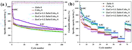 (a) Cyclic curves of ZnSe–S, CoSe2–S, and ZnSe/CoSe2–S cathode materials with different Zn–Co ratios at low current densities of 0.2 C. (b) The rate properties of ZnSe–S, CoSe2–S, and ZnSe/CoSe2–S anode materials with different Zn–Co ratios at 0.05–5 C.