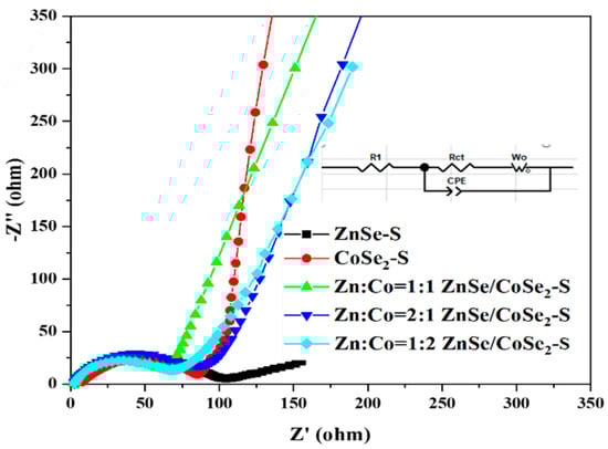 EIS spectra of ZnSe–S, CoSe2–S, and ZnSe/CoSe2–S with different Zn–Co ratios electrode materials before cycling.