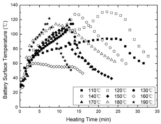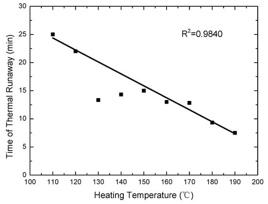 It can be seen from the relationship between the TRT temperature and the TRT time that the time required for the TRT decreases with the increase in TRT temperature. Considering the duration and operation feasibility of the experimental method, 170 °C was selected as the TRT temperature to trigger thermal runaway in the follow-up experiment.