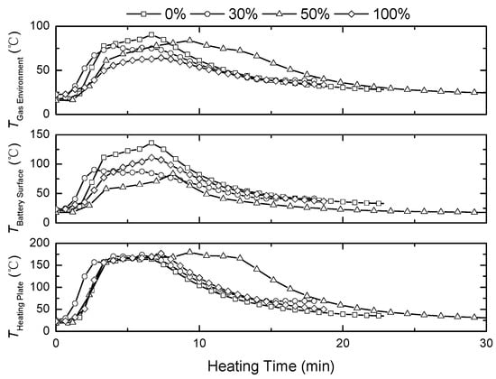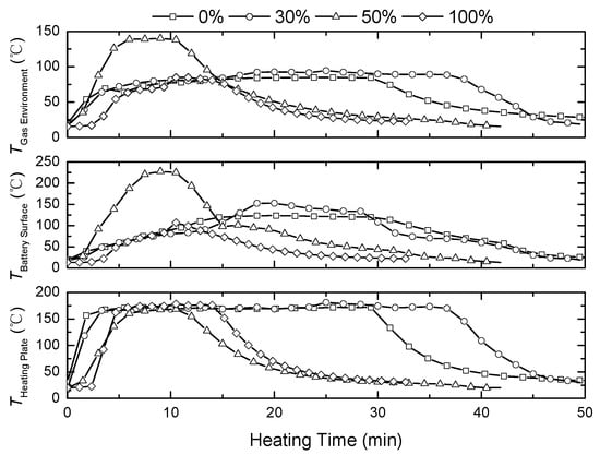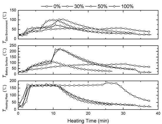 After the electric heating plate was turned on, the surface temperature of each NMC with different SOC rose slowly. After heating for 2 min, the temperature rose rapidly, and the electrolyte leaked from the sealed part of the battery, accompanied by smoke generation. The heating rate tended to be flat after 4 min. At 9 min, a lot of electrolytes and smoke emitted from the battery. The phenomenon of battery samples at 30% and 50% SOC was particularly obvious, and the intensity of reaction increased with the increase in SOC. The 100% SOC battery samples even exploded and had an open flame.