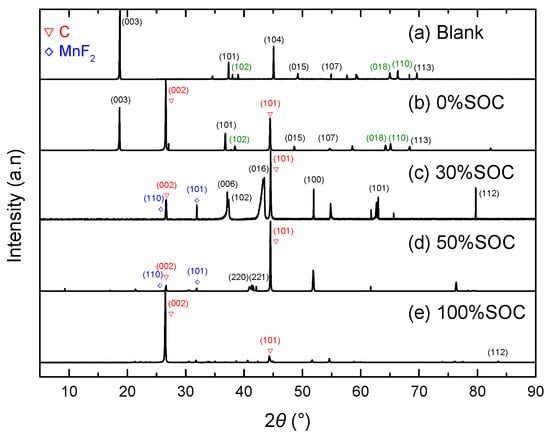 After the thermal runaway test was completed, the cathode material of the battery was collected for electron microscope characterization and XRD detection and analysis. In the XRD spectrum of the blank sample of NMC before thermal runaway (Figure 7a), the splitting peak (006)/(102) was relatively weak, while the splitting peak (018)/(110) was relatively obvious, indicating that ternary materials have good layered morphology and representing that the blank sample has a relatively typical hexagonal layered crystal system structure. After the thermal runaway process, the above characteristic peaks of the 0% SOC NMC sample (Figure 7b) did not change much, indicating that the electrode structure had not been damaged. With the increase in SOC, the characteristic peaks (006)/(012) and (108)/(110) did not completely split or even disappear, indicating that during the thermal runaway process, the cathode material underwent decomposition and led to the destruction of the layered structure. In the spectrogram of 30% SOC (Figure 7c) and 50% SOC (Figure 7d) NMC samples, there were two diffraction peaks at 2θ = 25.8° and 32.7° that can be attributed to the (110) and (101) crystal planes of tetragonal MnF2, indicating that the cathode material reacted with the electrolyte after decomposition. It could be observed that the NMC samples with 0%, 30%, and 100% SOC (Figure 7b,c,e) have obvious carbon characteristic peaks (002) and (101), indicating that during the thermal runaway reaction, some carbon powder entered the cathode. However, 100% SOC NMC could observe the carbon characteristic peak only, which indicated that with the violent explosion, the cathode was completely destroyed and cannot be detected.