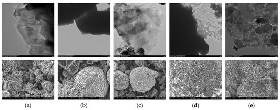 TEM and SEM characterization of NMC with different SOC before and after thermal runaway; the first row shows the TEM images; the second row shows the SEM images; (a) blank sample; (b) 0% SOC; (c) 30% SOC; (d) 50% SOC; (e) 100% SOC.