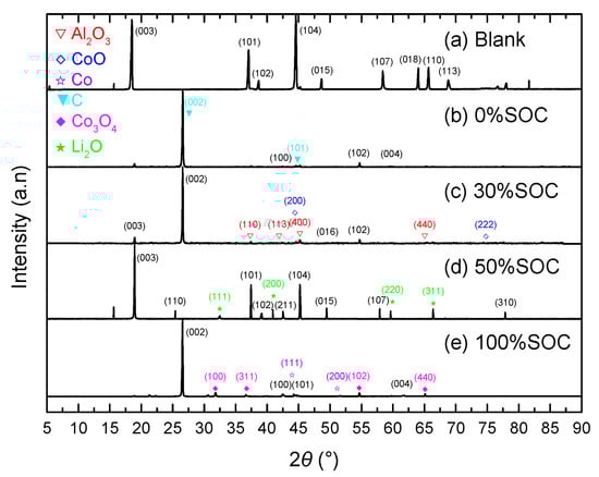 Through XRD analysis of the wreckage of LCOs, it was found that the structure of all samples had changed. For the 0% SOC LCO, possibly due to the long-term high temperature, the membrane had been damaged, the anode carbon mixed into the cathode, and the characteristic peak of carbon was shown in the XRD spectrum (as shown in Figure 9b). In the 30% SOC LCO (Figure 9c), the cathode aluminum foil was oxidized at high temperature, as the characteristic peak of Al2O3 (110), (113), (400), (440) appeared at 2θ = 37.73°, 43.30°, 45.78° and 66.76°. In addition, the cathode material was decomposed and the characteristic peak of CoO (200), (222) was found in the spectrum at 2θ = 42.3° and 77.5°. Li2O was found in 50% SOC LCO samples (Figure 9d), indicating that Li was completely oxidized in the battery at high temperature. CoO and Co (111), (200) were found in the 100% SOC LCO samples (Figure 9e), which shows that after the cell membrane was melted, the cathode material would decompose and release oxygen (as shown in Formulas (1)–(3)).