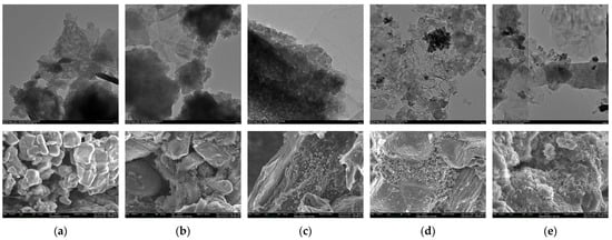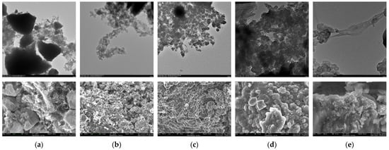 TEM and SEM characterization of LFP with different SOC before and after thermal runaway; the first row shows the TEM images; the second row shows the SEM images; (a) blank sample; (b) 0% SOC; (c) 30% SOC; (d) 50% SOC; (e) 100% SOC.