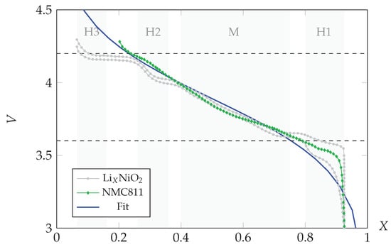 Lithium layered-oxides with high nickel content, such as NMC811, deliver high capacities but also face stronger capacity fading due to mechanical degradation and surface densification [4]. The cycling of LiNiO is accompanied by multiple phase transitions [28,32] and indications for similar transformations have been observed for NMC811 as well [4], although the voltage curve at low (dis)charge rates does not feature distinct steps and plateaus (see Figure 1). For the purpose of this study, we assume an ideal solution behavior in the voltage range 3.6–4.2 V. As a consequence, the chemical free energy and the resulting chemical potential are expressed as