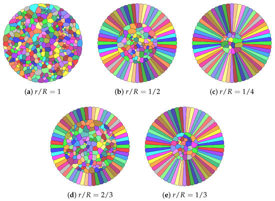 The radius r of the inner core is systematically varied, starting from that corresponds to a sphere of randomly oriented grains (“gravel-NMC” [8]), to a ratio of where the microstructure is dominated by aligned grains. Randomized grain structures for the inner core are created by Voronoi tesselation. All structures are pre-conditioned using the multiphase-field method, in the sense that diffuse transition regions between order parameters of indiviual grains are established by solving the corresponding phase evolution equations [11,26,27]. The grain structures are assumed to be stable at room temperature such that no microstructure evolution occurs during cycling.