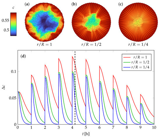 Relaxation of concentration gradients in comparison for the three microstructures with , , and (Figure 2a–c). The concentration gradient is measured as the difference between the maximal and minimal concentration value. Spatial concentration distribution is exemplarily shown for h in subfigure (a–c), as denoted by the black dotted line in subfigure (d).