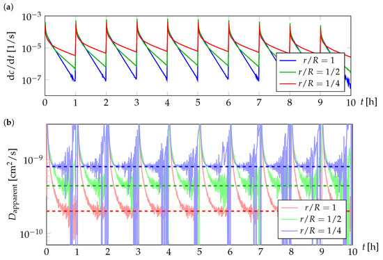 yields the results shown in Figure 4b. Only regions where the current follows an exponential decay fulfill the assumptions that have been used to derive Equation (9). Over the course of ten potential steps, the computed apparent diffusivities are very reliable and the average values have been marked by dashed lines. It should be noted that the noise in our evaluation becomes larger the faster the average diffusivity is. This is an artefact of the small changes of ion concentration close to equilibrium, where the computed diffusivity values are dominated by trunctuation errors.