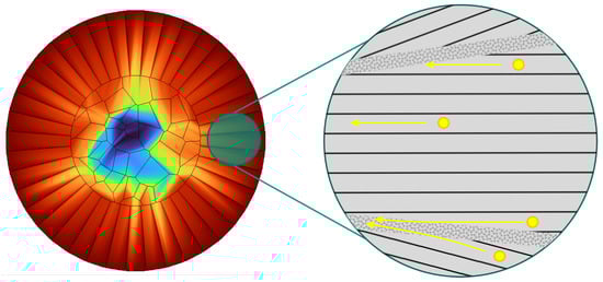 Lithium diffusion in NMC811 is simulated in two-dimensional domains for varying microstructures, as shown in Figure 2. All secondary particles in this study are assumed to be spherical with an outer diameter of 10 µm [4] (i.e., µm). Inspired by various works with textured, rod-like microstructures [7,8,36], we assume a compact core with randomly oriented grains surrounded by a layer of radially aligned grains.