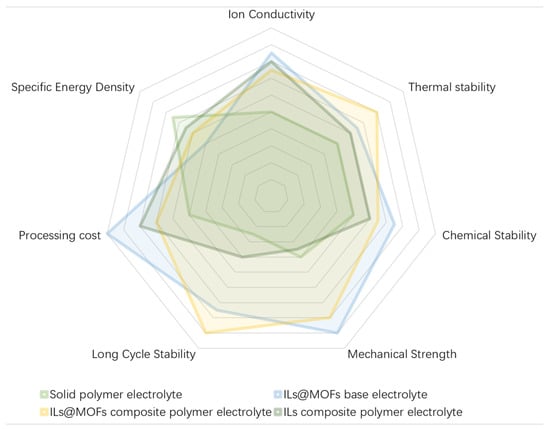 However, the highly conductive ionic transport paths would be blocked when the content of particles continuous to increase and unavoidable aggregation occurs, and the ion transport path through polymer matrix is also diluted by the aggregated fillers. Although ions can be transported through the matrix and filler, the polymer phase and the inorganic phase undergo mutual obstruction, which eventually leads to a decrease in ionic conductivity [85]. In the current study on the addition of ILs@MOFs, Sun et al. found a slight increase in polymer ionic conductivity with the addition of small amounts of ILs@MOFs, and a significant increase in conductivity can be obtained after the loading amount achieved a certain extent, which triggered the generation of continuous ion channels [39]. Mai et al., on the other hand, proposed a solid-liquid-like transport interface mechanism [72]. They concluded that the ILs@MOFs material added in the experiment acts as a high-speed migration path for lithium-ion transport between polymer chains through experimental and computational analysis of diffusion energy barriers. Lithium ions bounded by polymer chain segments are solvated on the surface of ILs@MOFs by TFSI− to enter the framework. Simultaneous desolvation of an equal amount of lithium ions is transferred to other PEO chains. The lithium ions in ILs@MOFs exhibit significantly stronger mobility, and the electron density in the micropores changes after the addition of ionic liquids. It is difficult to determine both the lithium ion and external lithium salt concentrations and energy levels inside the filler, which poses a new challenge to the application of space charge layer theory. More scientific evaluation methods for compatibility of ionic liquids, MOFs materials, and polymeric substrates, and Li+ migration paths in the solid-liquid systems of ILs@MOFs are still required for future research applications.