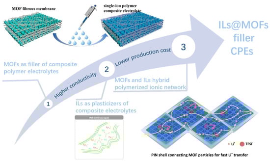 Notably, in view of the advantage of high conductivity, stable structure and high chemical compatibility, other types of newly developed solid electrolytes have become substantial alternatives for ceramic electrolytes and composite polymer electrolytes [9,10,11]. Most recently, ionic liquids (ILs)@metal organic frameworks (MOFs) have emerged as a promising candidate material for potential utility because of their high ion conductivity, abundant metal sites, large specific surface area and modulable ability [12]. Unlike conventional carbonate solvents, ionic liquids are a class of molten salts that exist entirely in ionic form at room temperature. Generally speaking, the cations of ionic liquids are derivatives of 1-methylimidazole and anions are conjugate bases of inorganic acids [13]. Equipped with unique properties such as nonflammability, low vapor pressure and electrochemical stability [14], ionic liquids have been widely used in Li-ion batteries to replace carbonate solvents or participate in the formation of functional SEI [15]. Apart from that, ionic liquids can also be used as stabilizing agents in solid-state batteries to improve interface stability [16]. However, the direct use of ionic liquids as liquid electrolytes still cannot avoid the problem of Li dendrites caused by low Li+ transference number (tLi+) and possible liquid leakage. The low transference number originates from the free anion and cation migration. Although the nonflammable ILs avoid electrolyte combustion, the dendrite remains can penetrate the separator and cause a short circuit under abuse conditions. Meanwhile, the high cost of the ionic liquids system impedes the application progress of lithium-ion batteries. Hence, some researchers use MOFs to confine ILs, which achieves high performance solid-state electrolytes with a low ILs dosage, contributing to the transition metal ion or clusters and organic ligands on MOFs [13]. In the 1990s, Robison and Hoskins reported the first successfully synthesized MOF [N(CH3)4][CuIZnII(CN)4] [17], the stable porous structure, diverse combination of metal and organic units and the tunable electrochemical property of which attracted the interest of researchers [18,19,20,21]. Usually, simple and inexpensive methods such as the microwave-assisted heating method, hydrothermal method and solvent self-assembly methods have been proposed to synthesize MOFs [22,23,24]. Through a self-assembling procedure in a solution experiment, the chemical bonds formed between organic ligands and metal ions can bring the unique properties which cannot be achieved in other skeletal compounds [25]. Compared with ILs hybrid electrolyte and SPEs in Figure 1, using MOFs to confine ILs can not only avoid leakage of ILs and provide mechanical suppor, but also facilitate the ion conductivity of MOFs material. Consequently, with tunable porosity, rich Lewis acidic active sites and a modular nature, ILs@MOFs have been regarded as promising materials for applications as electrolyte of solid-state lithium batteries.