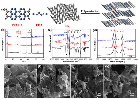 (a) Schematic of PDI-EDA/EG composite preparation. (b) XRD patterns, (c) FTIR spectra, and (d) Raman spectra of EG, PDI-EDA, PDI-EDA/EG-20. (e–h) SEM images of PDI-EDA, PDI-EDA/EG-10, PDI-EDA/EG-20, and PDI-EDA/EG-30 samples, respectively.