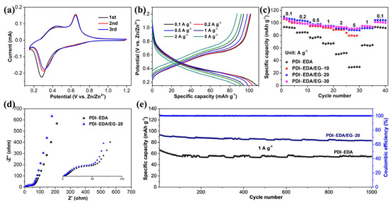 Based on the above discussion, the PDI-EDA/EG samples are expected to deliver superior Zn2+-storage properties. The electrochemical performance of pure PDI-EDA and PDI-EDA/EG samples was evaluated in coin-type ZIBs with 2 M ZnSO4 as electrolyte and Zn foil as counter and reference electrode. First, the working potential of PDI-EDA/EG was optimized. As shown in Supplementary Figure S3, 0.15–1.2 V is preferable due to the limited HER. Figure 2a displays the initial three cyclic voltammetry (CV) profiles of the PDI-EDA/EG-20 electrode at a sweep rate of 0.2 mV s−1. Obviously, all three CV curves exhibit similar cathodic and anodic peaks, demonstrating the high reversibility of the electrode. The first circuit is slightly dissimilar to the second and third circuits, which could be attributed to the irreversible reactions and the formation of a solid electrolyte interface (SEI) on the Zn anode surface [9,14]. The CV profiles of PDI-EDA, PDI-EDA/EG-10, and PDI-EDA/EG-30 electrodes are also collected for comparison (Supplementary Figure S4a,c,e). The galvanostatic charge/discharge (GCD) profiles of the four anodes at different current densities were recorded to compare their electrochemical performance (Figure 2b, Supplementary Figure S4b,d,f). Evidently, as the current densities increase, the PDI-EDA/EG samples show less capacity decay than the pure PDI-EDA, demonstrating their lower electrode polarization at high current densities.