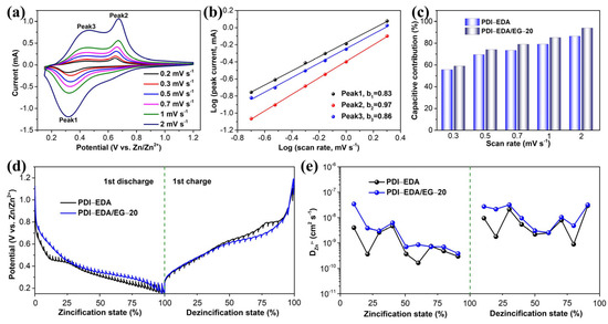 To examine the fast electrochemical reaction kinetics of Zn2+ storage in the PDI-EDA/EG-20 electrode, the CV profiles at different sweep rates were conducted (0.2–2 mV s−1) and shown in Figure 3a. All the CV curves exhibit similar shapes without obvious peak deviations as the sweep rate increases, manifesting highly reversible redox reactions. The relationship between the obtained peak current (i) and sweep rate (v) can be used to quantitatively evaluate the Zn2+ storage kinetics by the power-law formula [25,42]: , where b = 0.5 suggests a diffusion-controlled process, while b = 1.0 indicates a pseudocapacitive behavior [9,42]. As for the PDI-EDA/EG-20 electrode, the b values of 1, 2, and 3 peaks can be calculated to be 0.83, 0.97, and 0.86 (Figure 3b), respectively, demonstrating a fast pseudocapacitive process instead of solid-state diffusion for Zn2+-storage. The b values of PDI-EDA (Supplementary Figure S6a,b), PDI-EDA/EG-10 (Supplementary Figure S6c,d), and PDI-EDA/EG-30 (Supplementary Figure S6e,f) electrodes are also calculated for comparison. In order to quantify the pseudocapacitive contribution ratio, the whole capacity can be divided into pseudocapacitive contribution (k1v) and diffusion-controlled contribution (k2v1/2) under fixed potential (V) by the equation: [42,43]. Figure 4c summarizes the proportions of pseudocapacitive contribution in PDI-EDA and PDI-EDA/EG-20 electrodes. The pseudocapacitive contribution ratios of the PDI-EDA/EG-20 electrode at 0.3, 0.5, 0.7, 1, and 2 mV s−1 were 59.1, 74.1, 78.9, 85.1, and 93.9%, respectively, which were significantly higher than those of the PDI-EDA anode. This further verified that the presence of EG can improve the pseudocapacitive contribution of PDI-EDA/EG-20 with enhanced ionic/electronic conductivity, thus delivering remarkable rate capability and cycling stability. Furthermore, the galvanostatic intermittent titration technique (GITT) was performed to assess the detailed electrochemical reaction kinetics during GCD processes (Figure 3d and Figure S7a). The corresponding Zn2+ diffusion coefficients (DZn2+) of PDI-EDA/EG-20 and PDI-EDA electrodes at different potentials could be calculated using the following equation [42]: